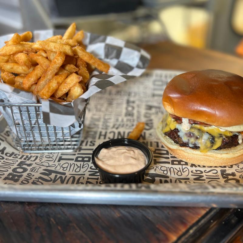 Our burgers are 8 oz grilled sirloin served to order. Served with fries or side salad | Onion Rings or Glazed Sweet Potato Fries +$3.00